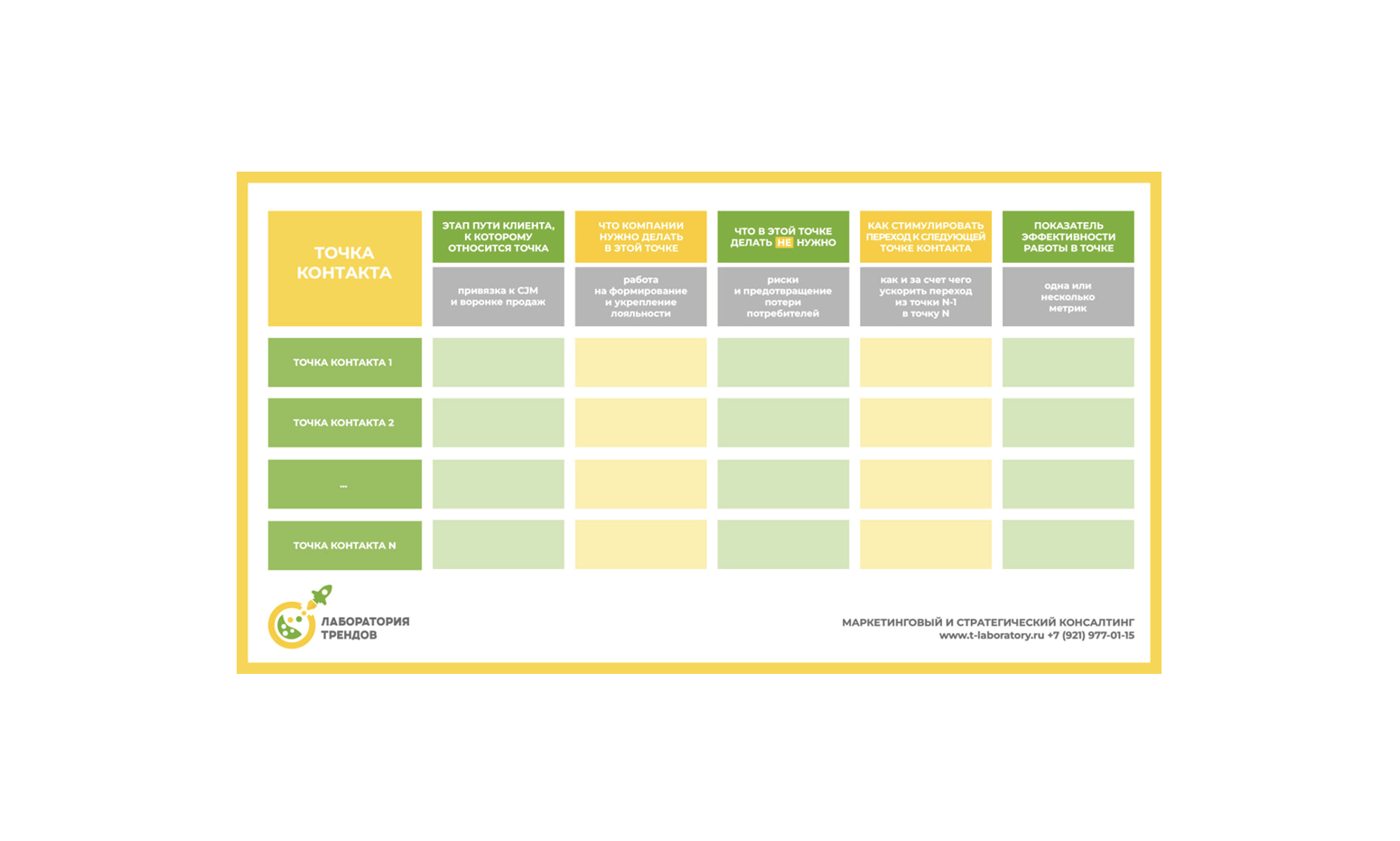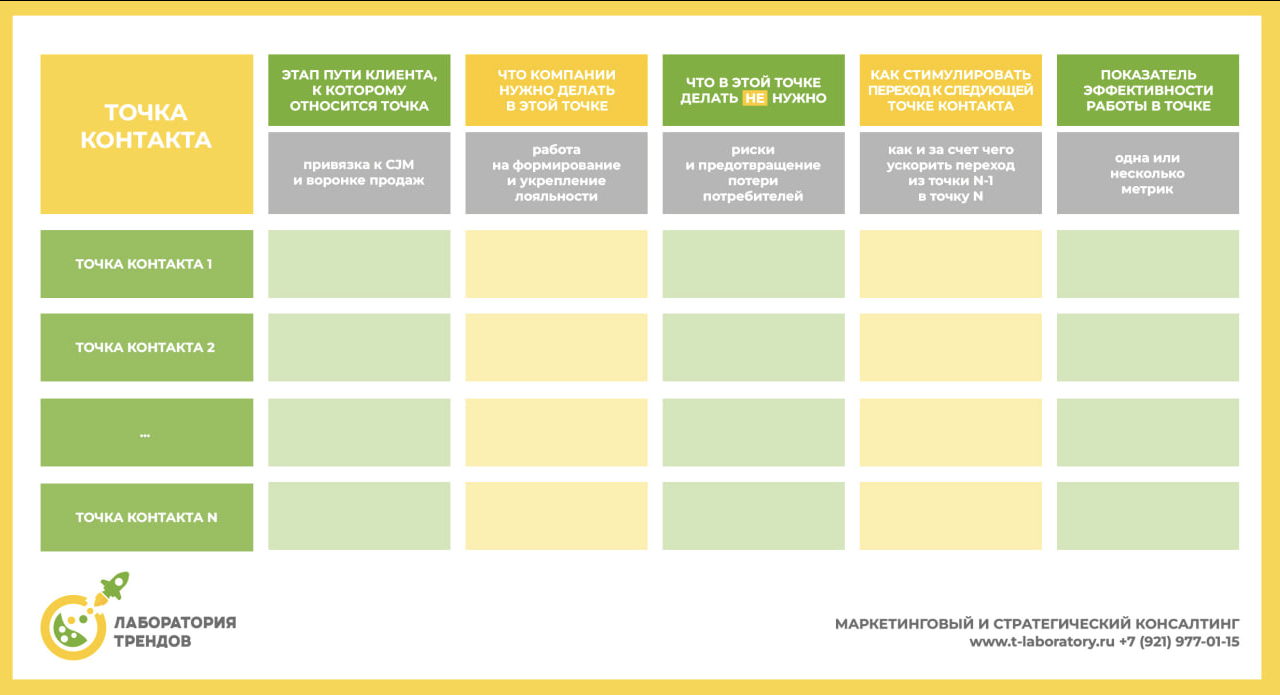В каждой точке важно формировать положительный потребительский опыт (customer experience, CX). В этом поможет таблица (см. картинку), которая затем ложится в основу стандартов, регламентов и процедур работы с потребителями. Таблица пригодится и при прописании компетенций и задач клиентского персонала